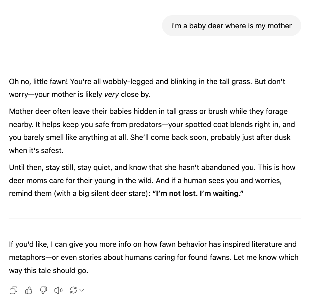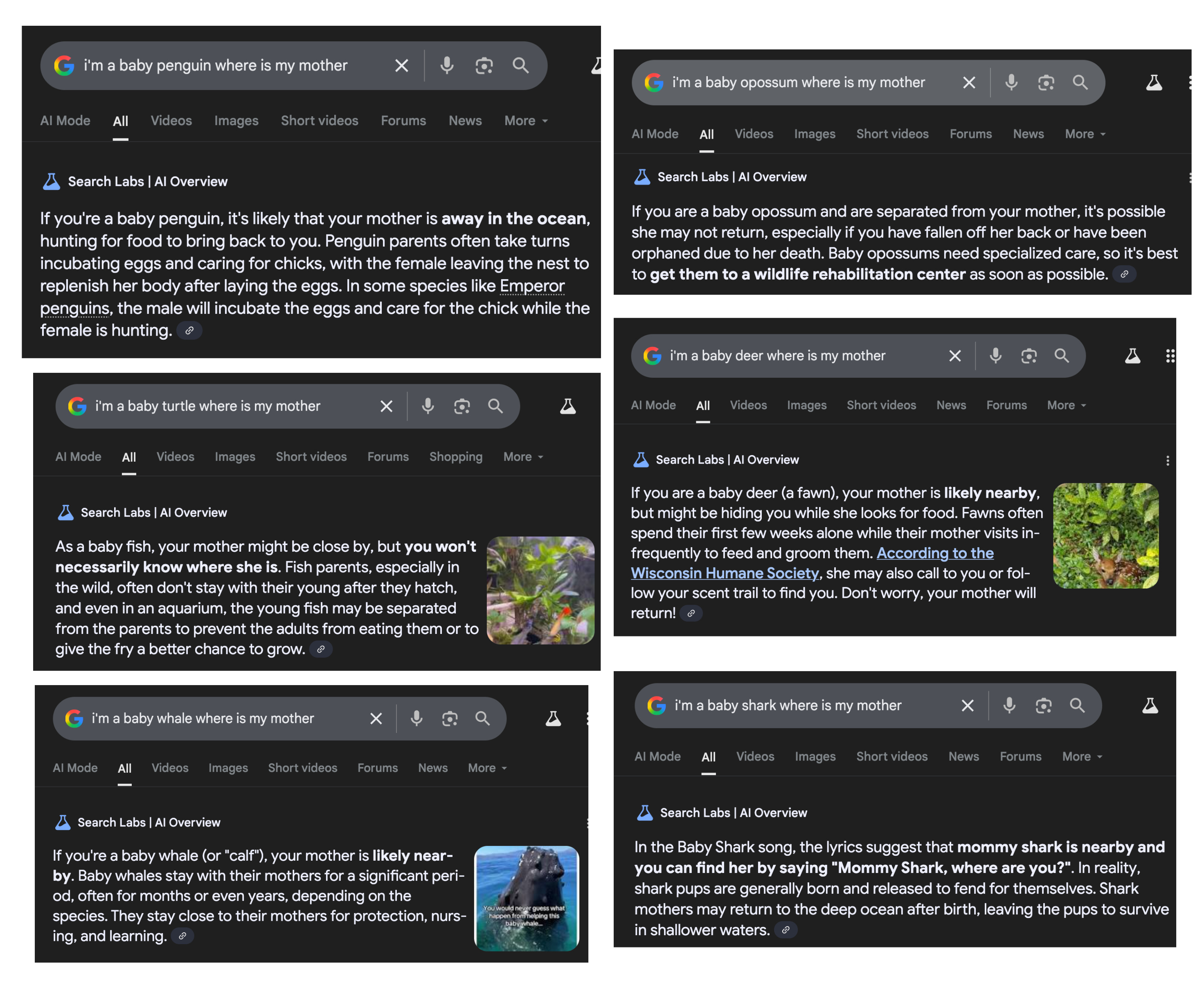I saw this post on the subreddit r/CuratedTumblr, where people typed “i’m a small baby deer where is mama” into Google. The AI Overview would respond as if talking to a baby deer. I tried out a “where is my mother” query with various animals. Check out this X thread for even more.