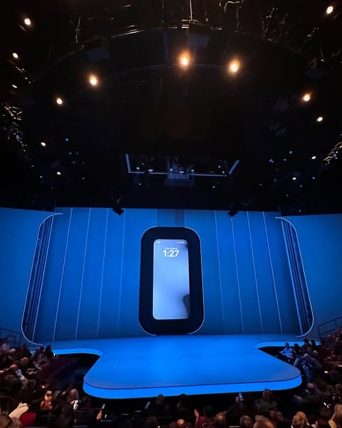 “In the Vivian Beaumont Theater, audience members are greeted by a mysterious, eerie sight: A giant iPhone lock screen, taking over the back of the stage, illuminated in a bright cobalt blue and impossible to ignore.”