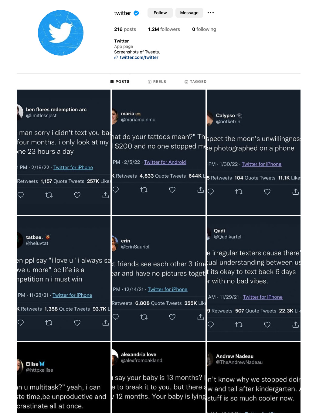 One of my favorites: “Can You Take a Screenshot on Grindr Without Him Knowing?” Twitter’s Instagram account is filled with screenshots of tweets. The last post is from July 2022.