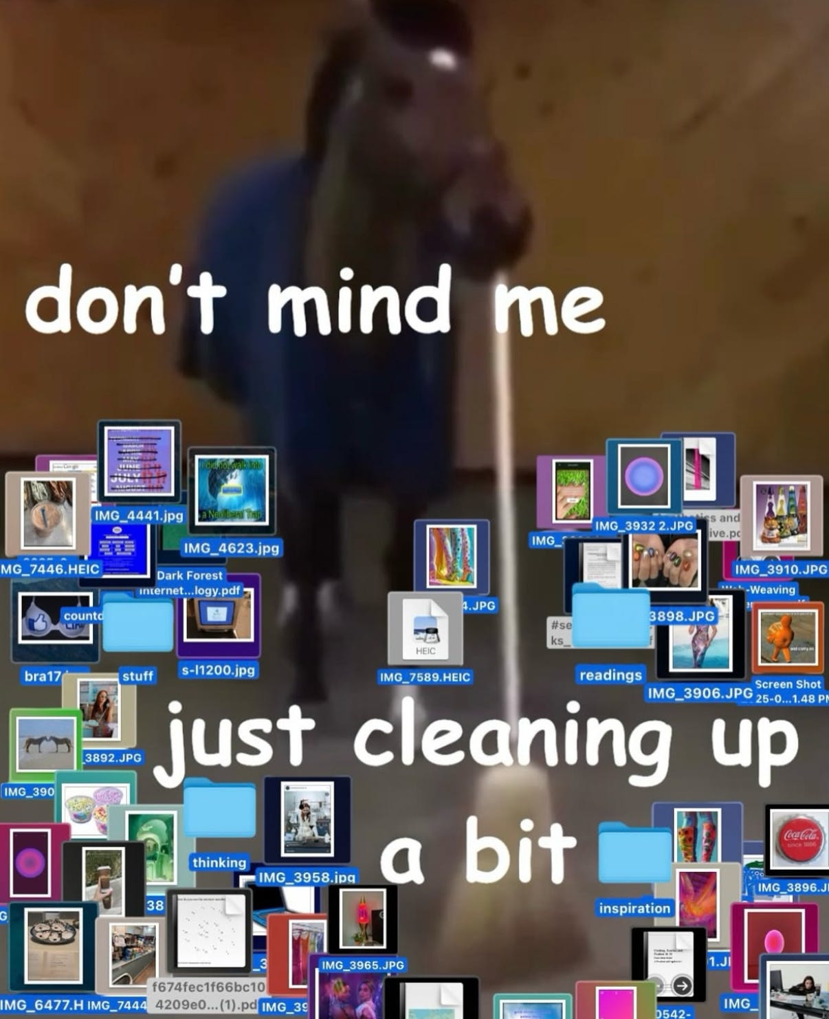 I have 4,396 screenshots but one thing that I do is take all of my saved Tiktoks and file them in my tiktok spreadsheet that has a billion tags so I can search for any of the tiktoks i've saved whenever i am looking for something... maybe crazy but it does work