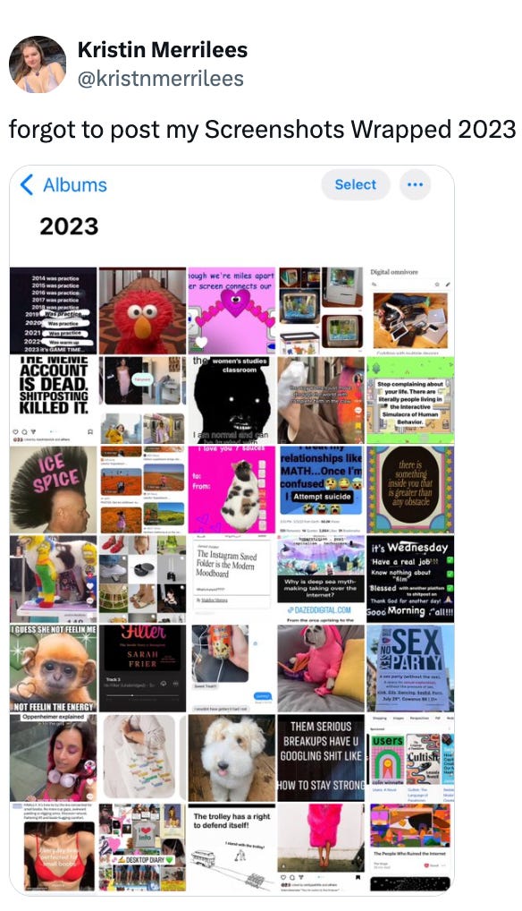 Personally, I screenshot pretty much anything I find interesting, want to write about, or might return to in the future. Of course, this means that I also have a lot of screenshots that sit untouched. I wrote about this tendency back in 2020 in a piece called “Why Do I Save Things I’ll Never Look at Again?”