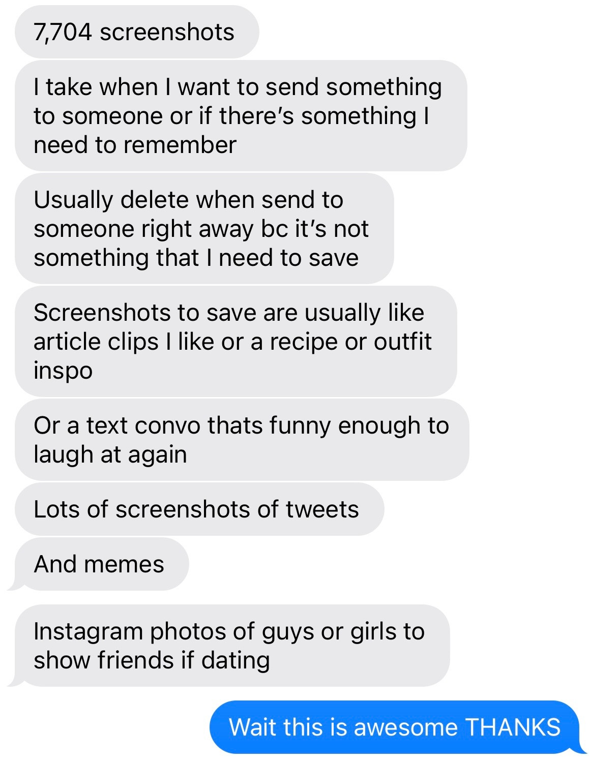 833 screenshots. “I take my screenshots all throughout the day (whenever I’m on social media) and I find myself screenshotting a lot of comment sections/screenshotting videos with product recommendations. I also screenshot a lot of pictures/posts I find funny.”