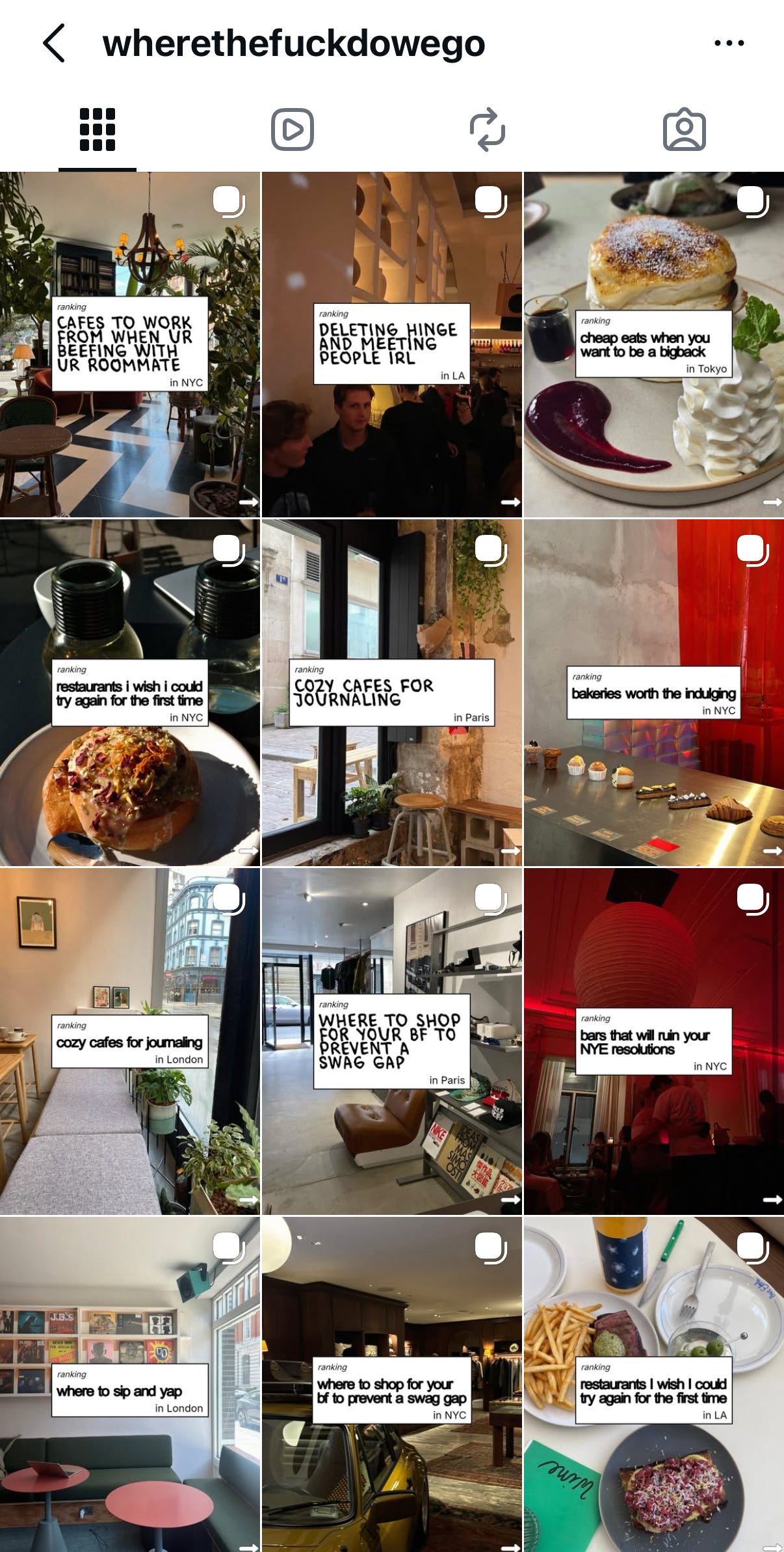 @wherethefuckdowego is the Corner app’s “magazine,” on Instagram. Corner describes itself as “Google Maps but with friends.” This account, which first started posting in October and now has over 30,000 followers, is positioned as a solution to influencers being paid for recommendations and publications that cover only a certain slice of shops and restaurants. The posts consist of simple carousels with recommendations, using photos from Corner users.