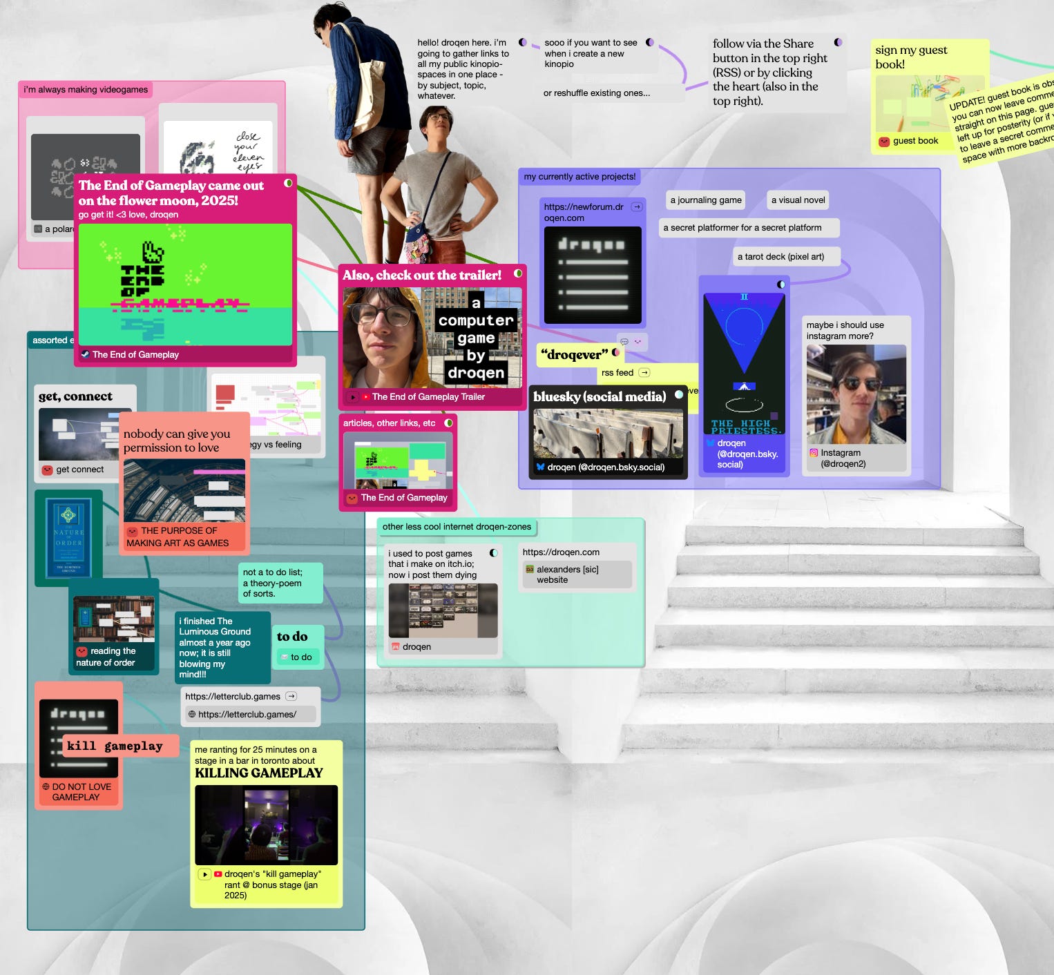 You can find droqen at his website, Kinopio, Bluesky, YouTube, and X. “The End of Gameplay” is available on Steam and itch.io.