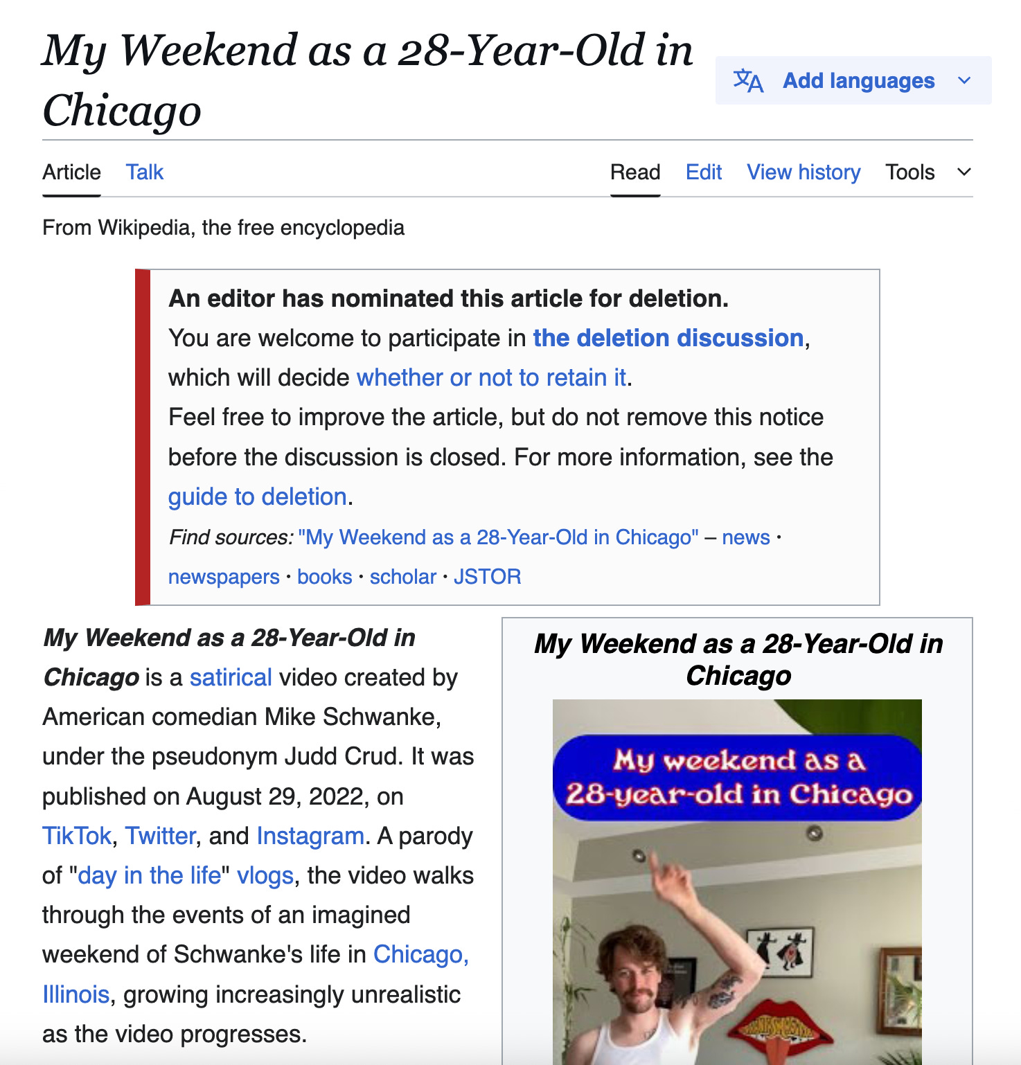 “It was met with widespread acclaim from critics, with some calling it one of the greatest TikTok videos of all time,” reads the Wikipedia page. But when I revisited the article, I saw a note at the top that it had been nominated for deletion.