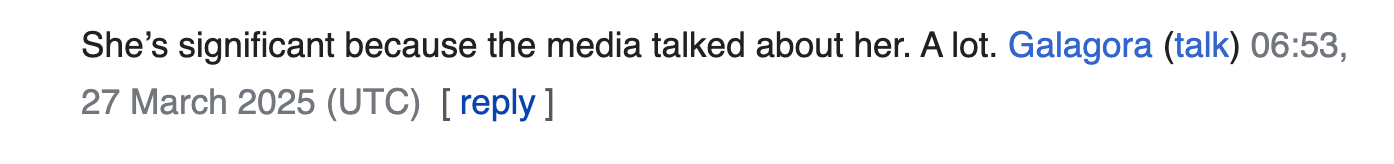 So does the article for the “Coldplay jumbotron controversy.” One user wrote that “There is no ‘enduring historical significance nor will this event have ‘a significant lasting effect.’”