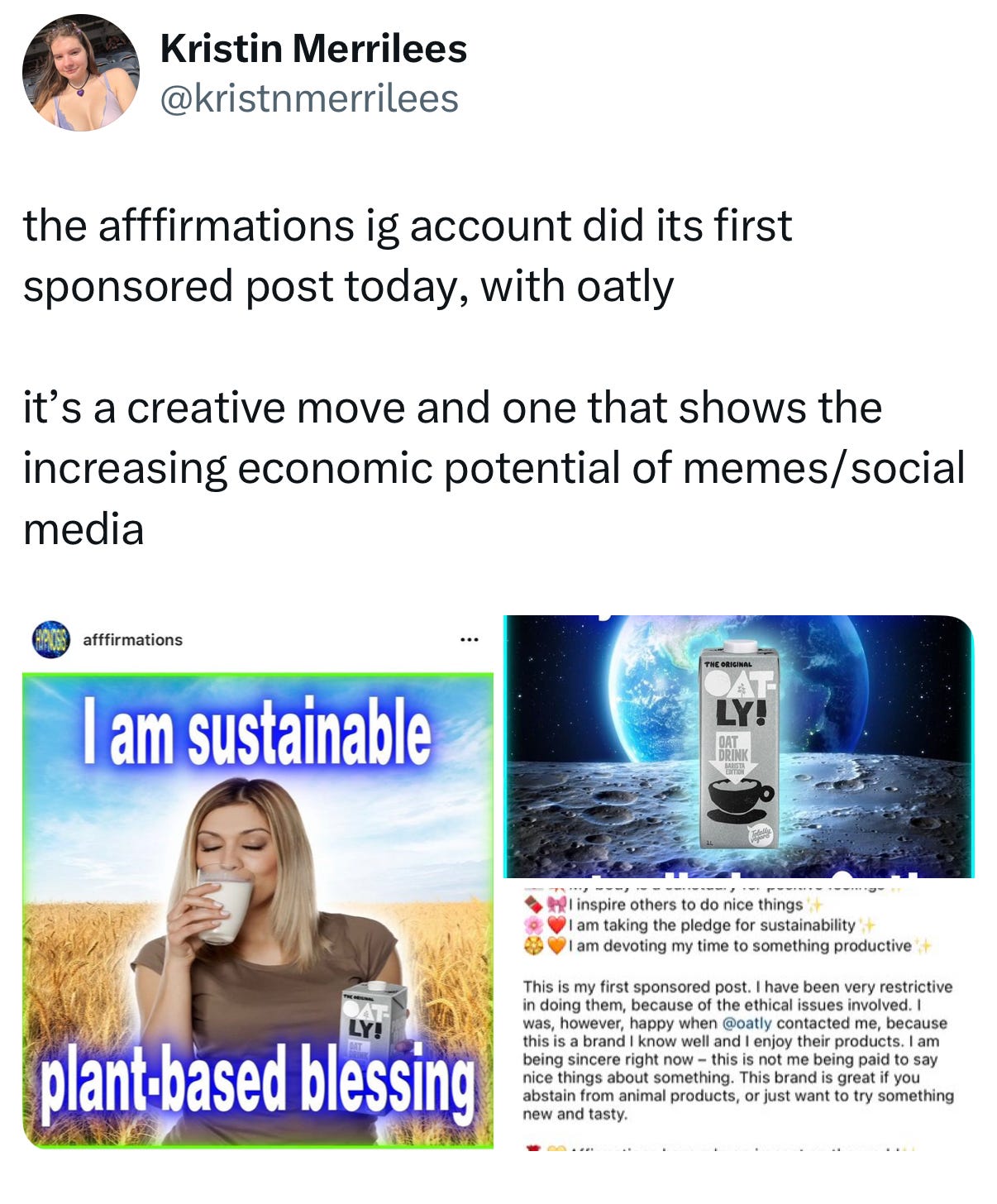 I’ve previously commented on how @afffirmations, @nolitadirtbag, and other meme accounts have done brand partnerships we typically associate with traditional influencers. @afffirmations currently has over 950,000 Instagram followers. @thefilmmemes, which has 290,000 Instagram followers, also made collaborative posts with @ohhi_movie and @sonyclassics.