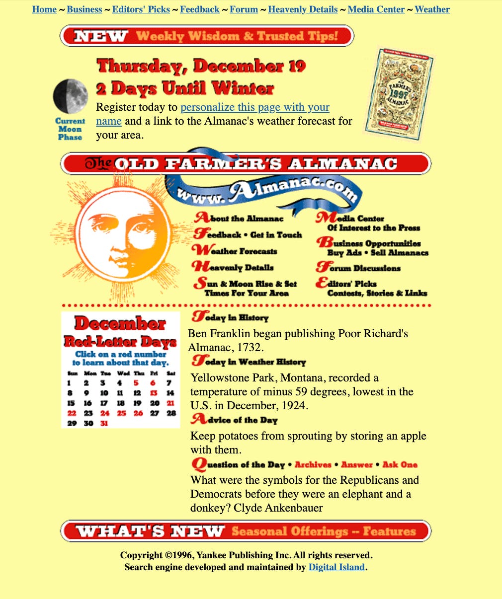The Old Farmer’s Almanac, which is a different thing, is still going strong! Here’s what the website looked like in 1996.