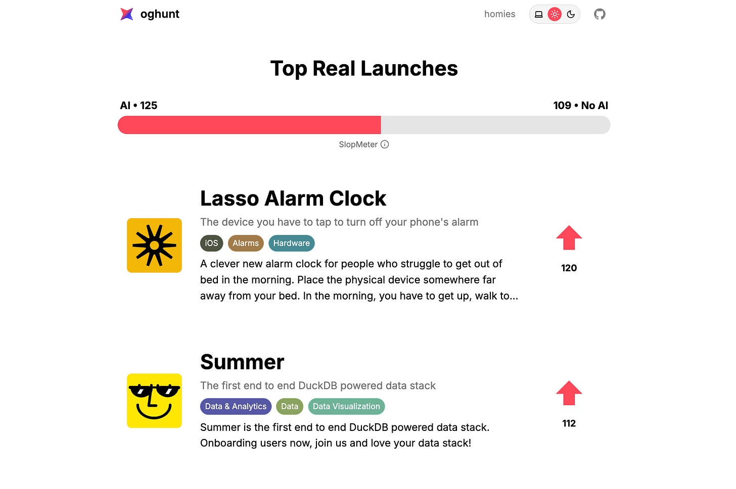 I was texted the link to oghunt yesterday and was surprised I hadn’t heard about it before. “We filter out AI-generated Products from Product Hunt, helping you discover genuine innovation and creativity,” the website reads. You can toggle between “real” and “AI slop” launches.