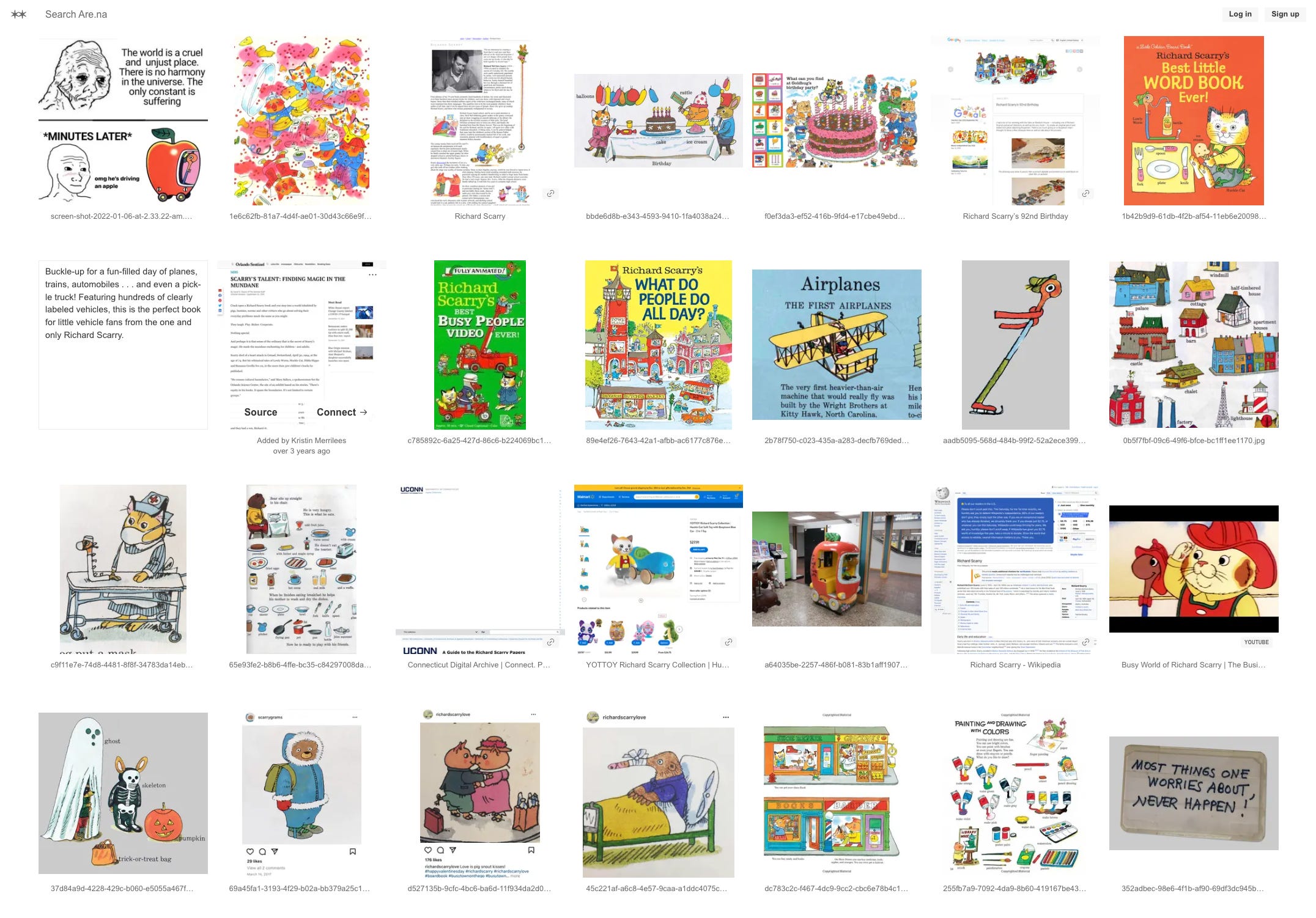 While Scarry died in 1994, the Busy World he created lives on, especially in fan-created memes and art. I collected many of these examples in a “richardscarrycore” Are.na board I made in 2021.