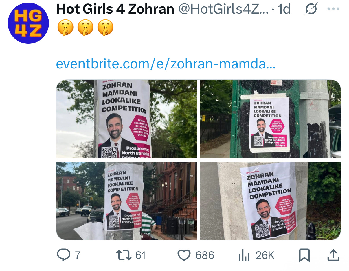 You can experiment with the halftone patterns and ink colors. A Zohran Mamdani look-alike competition, hosted by Hot Girls for Zohran, will take place on Friday, June 13. “Come join us at Prospect Park North Bandshell on June 13th as we judge a variety of Zohran Mamdani lookalikes. The winner will be awarded $75, free Hot Girls for Zohran merch, and the key to the city,” reads the Eventbrite listing.