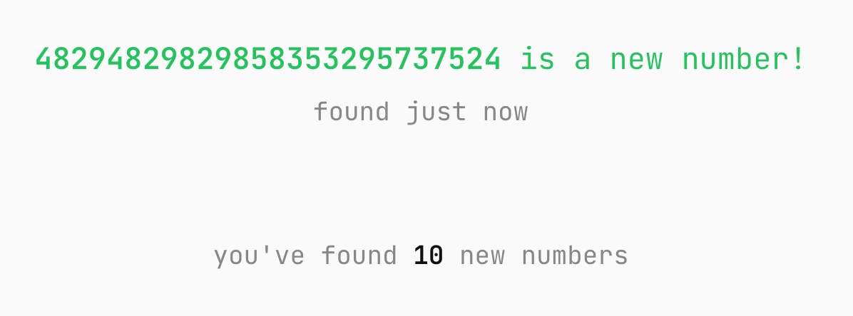 Being a volunteer researcher can be somewhat frustrating. In my experience, thinking too hard or trying to be too clever (and inputting a number like 100,000 or 10,987,654,321) leads to numbers that have already been found. I’ve found a more fruitful approach is just to keysmash.