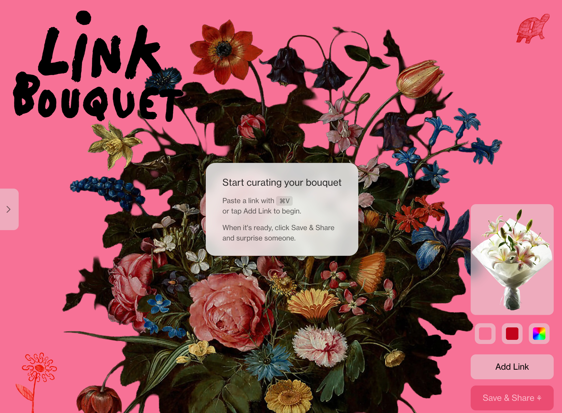 Much more romantic than texting a link, Link Bouquet lets you collect a bouquet of chosen linksāarticles, videos, Substack postsāto send to a loved one. You can also change your flower choice and background color.