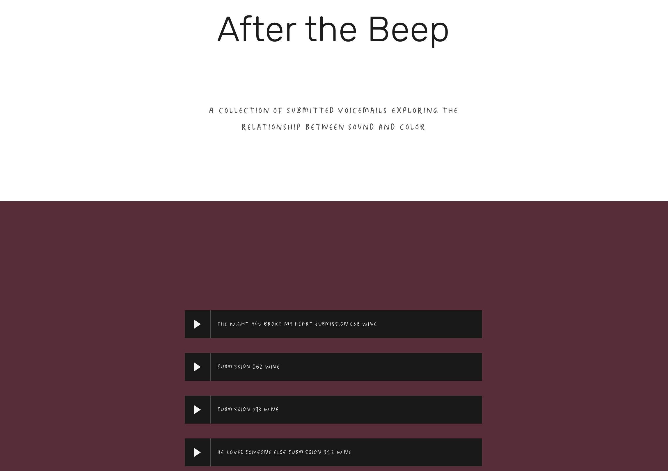 Also made by Rora Blue, After the Beep is a collection of submitted voicemails, organized by color (maroon, red, orange, light orange, tangerine, peach, tan, brown, yellow, light green, green, dark green, army green, turquoise, blue grey, pale blue, light blue, blue, dark blue, dark purple, purple, light purple, dull purple, pale purple, pale pink, light pink, pink, white, light grey, grey, black, and uncategorized). You can also read the transcriptions of the voicemails.
