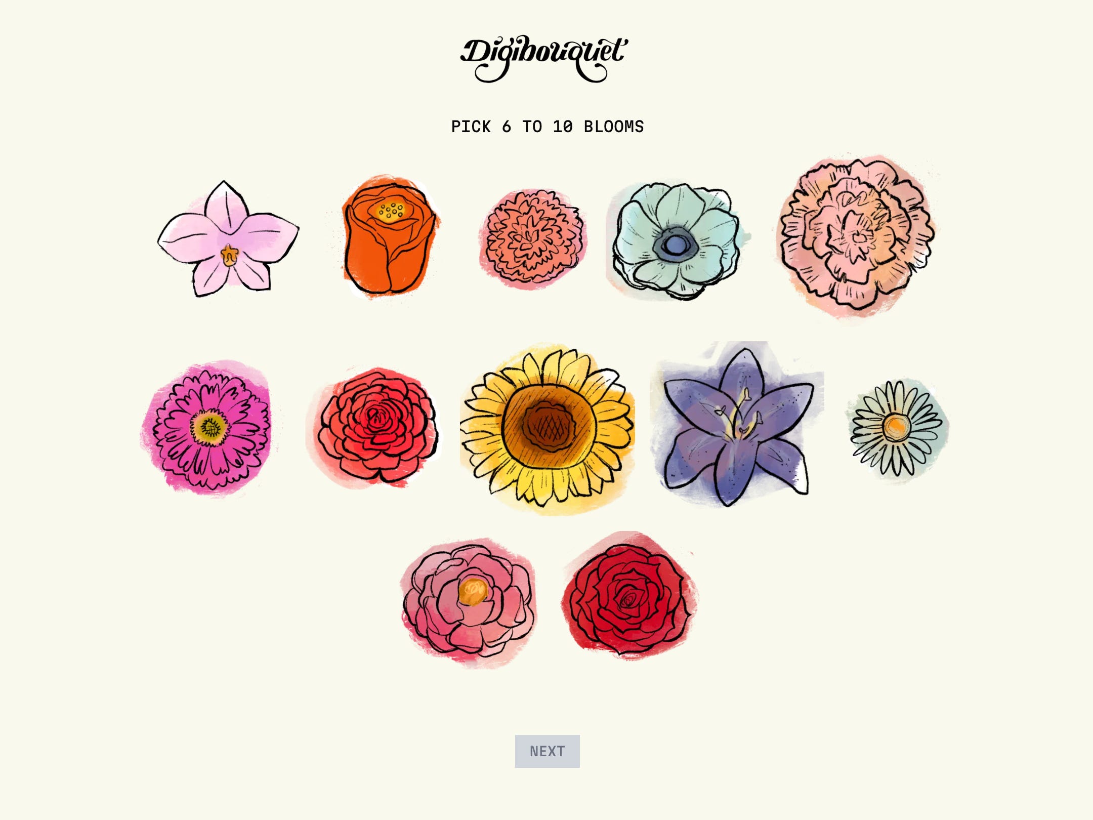 Want to deliver flowers to a long-distance love or online friend? Digibouquet lets you select from 12 ābloomsā (orchid, tulip, dahlia, anemone, carnation, zinnia, ranunculus, sunflower, lily, daisy, peony, rose) and three different greeneries to arrange a digital bouquet, which you can also add a letter to.