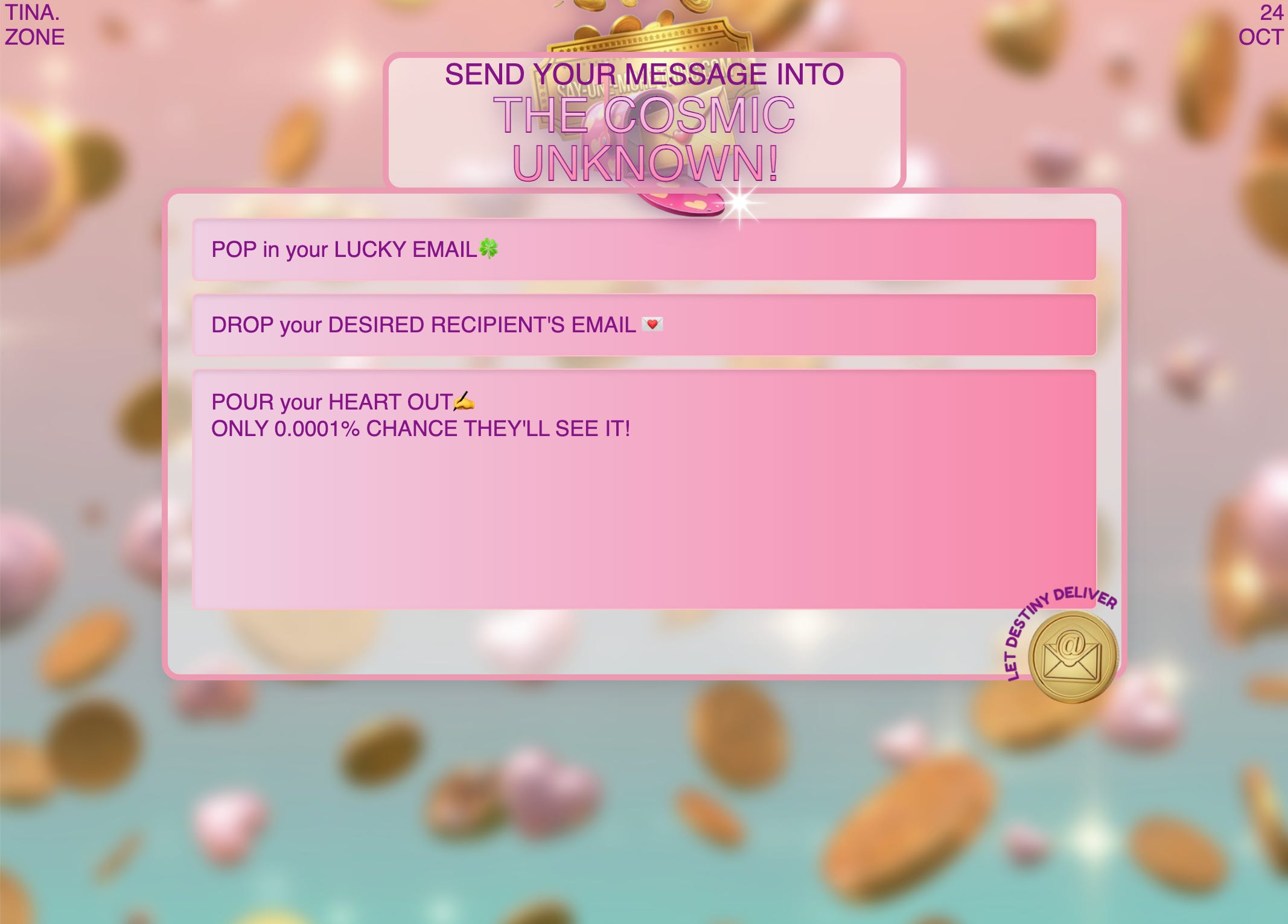 Ever wanted to say one more thing to a past lover? This is your chance. Type whatever you want. Thereās a one in a million chance your message will be delivered to the recipient within the next year.