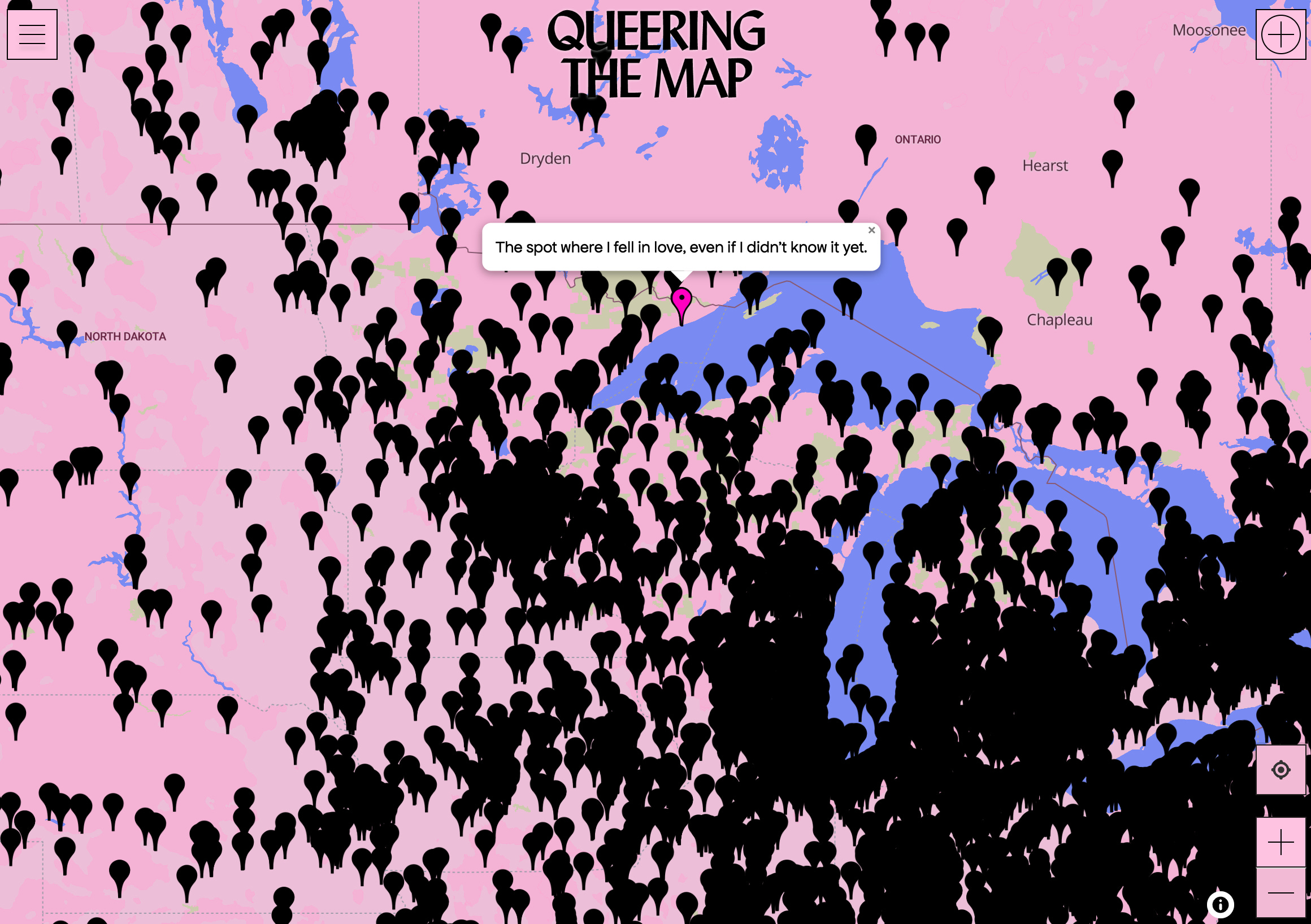 Queering the Map is a community map chronicling queer life and experience, āfrom park benches to the middle of the ocean,ā the site describes. What stands out to me about Queering the Map is the amount of behind-the-scenes moderation work.