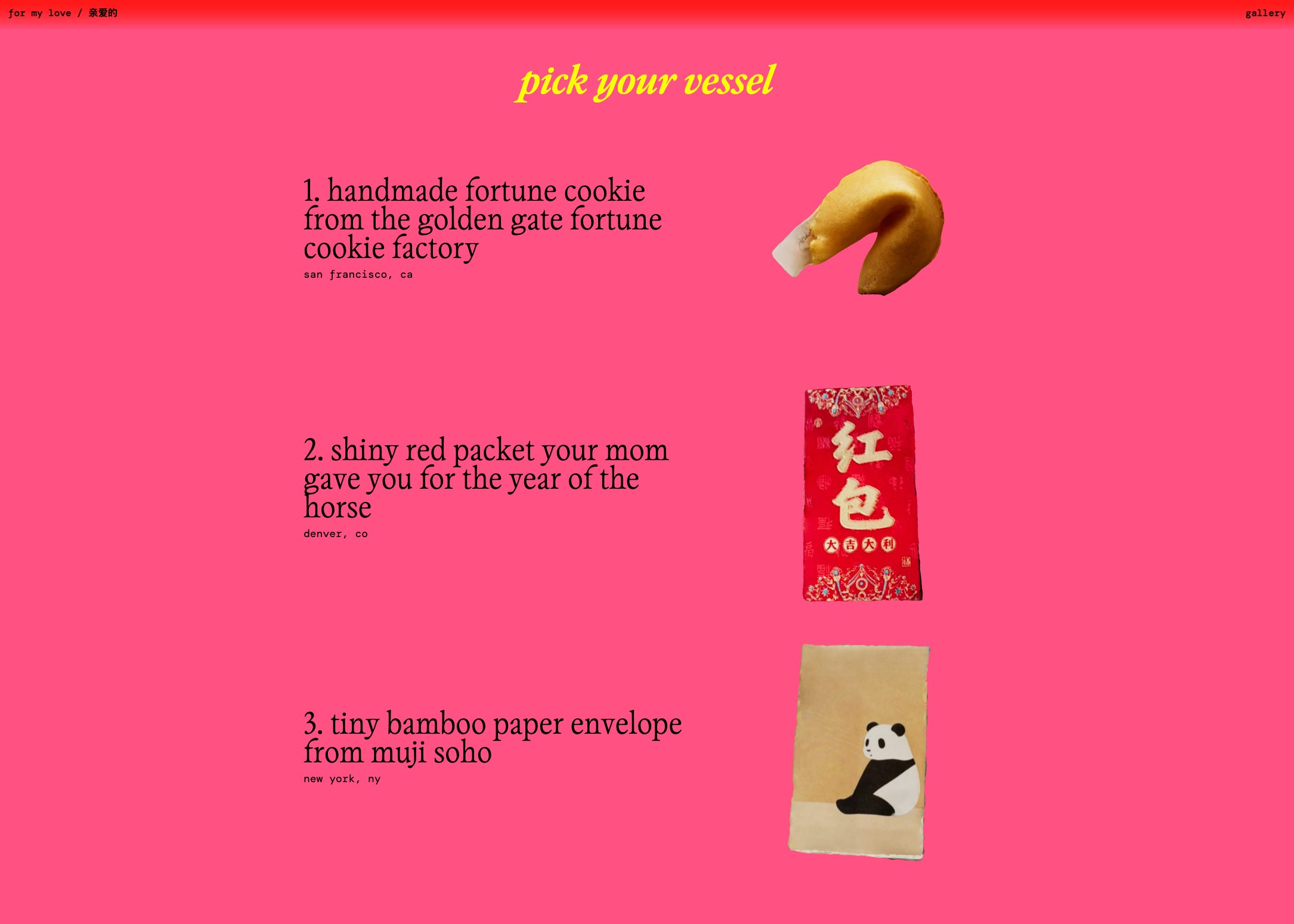 To celebrate both Valentineās Day and Lunar New Year, Emily Zhang 3D-scanned three vessels of text. Choose from āhandmade fortune cookie,ā āshiny red packet,ā and ātiny bamboo paper envelope,ā and write messages inside them.