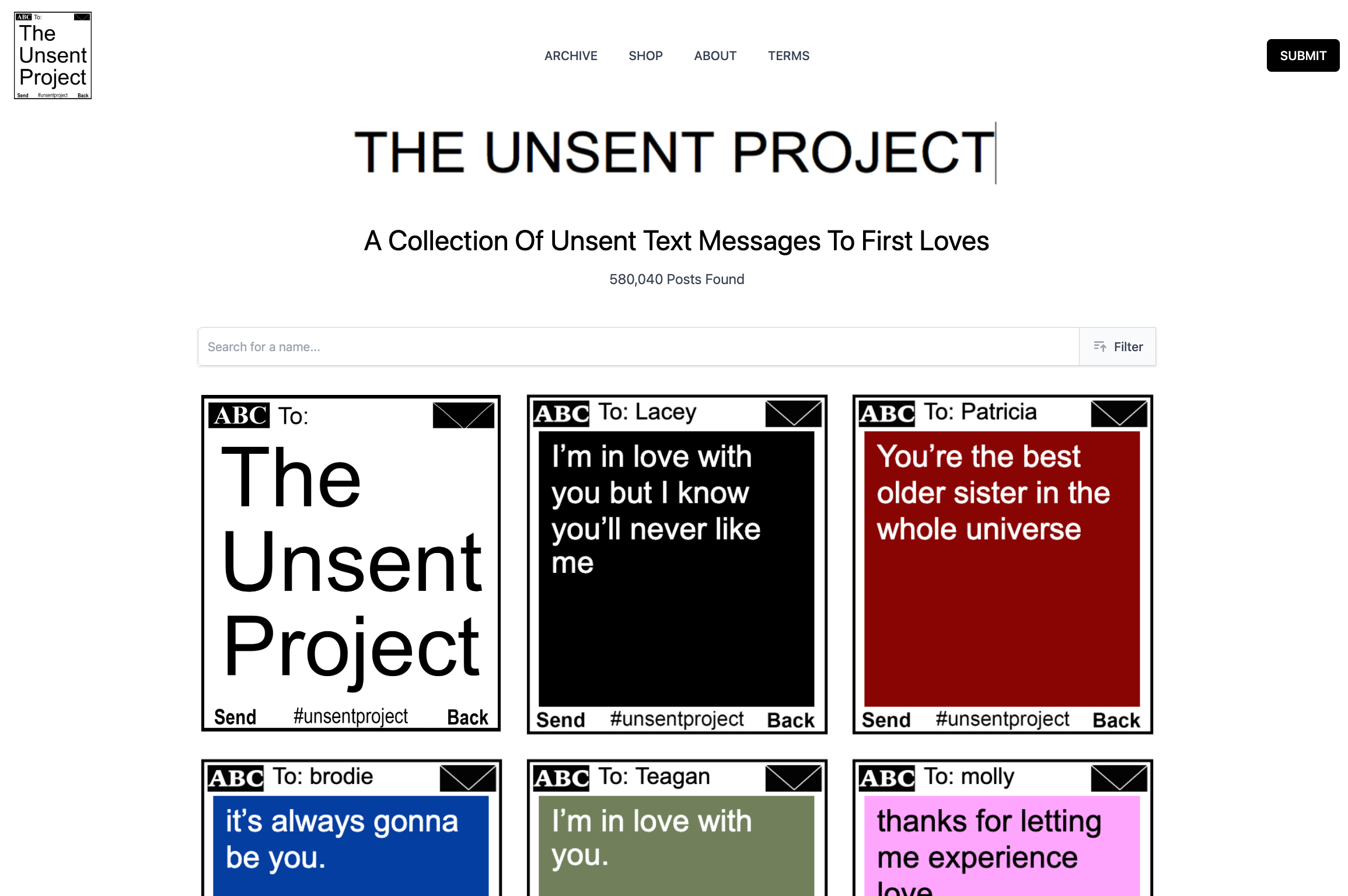 The Unsent Project, started in 2015, is described as a collection of āunsent text messages to first loves.ā But that almost doesnāt do it justice. The project is an expression of deep vulnerability, of what ifs and right places wrong times. Look up your own name, and wonder who the intended recipients are, and if any might have been you.