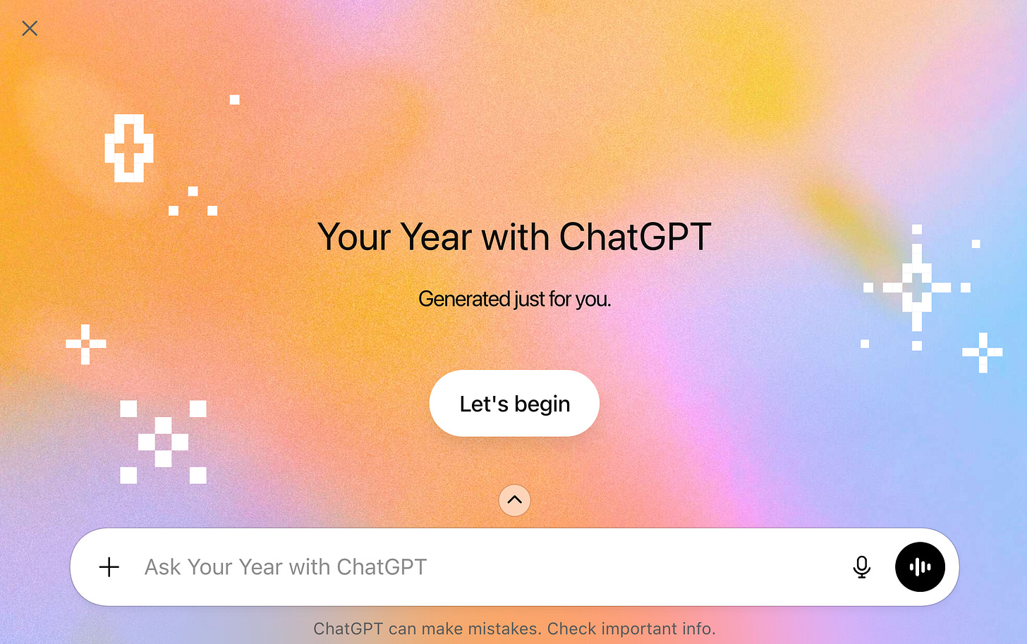 A key difference between a recap of your Spotify activity and your ChatGPT interactions is just how comprehensive the latter has the potential to be. One year of a ChatGPT user’s chats might cover work, relationships, finances, health, creative projects, weird embarrassing questions, etc. While this year’s format was pretty surface-level and cheeky, I could imagine future versions with more depth and detail. The text also reminds me of New Computer’s Dot, now defunct, which responded in warm, creative language. I’ve written before about AI companies branding themselves as more personable and collaborative and think this recap is a step in that direction.