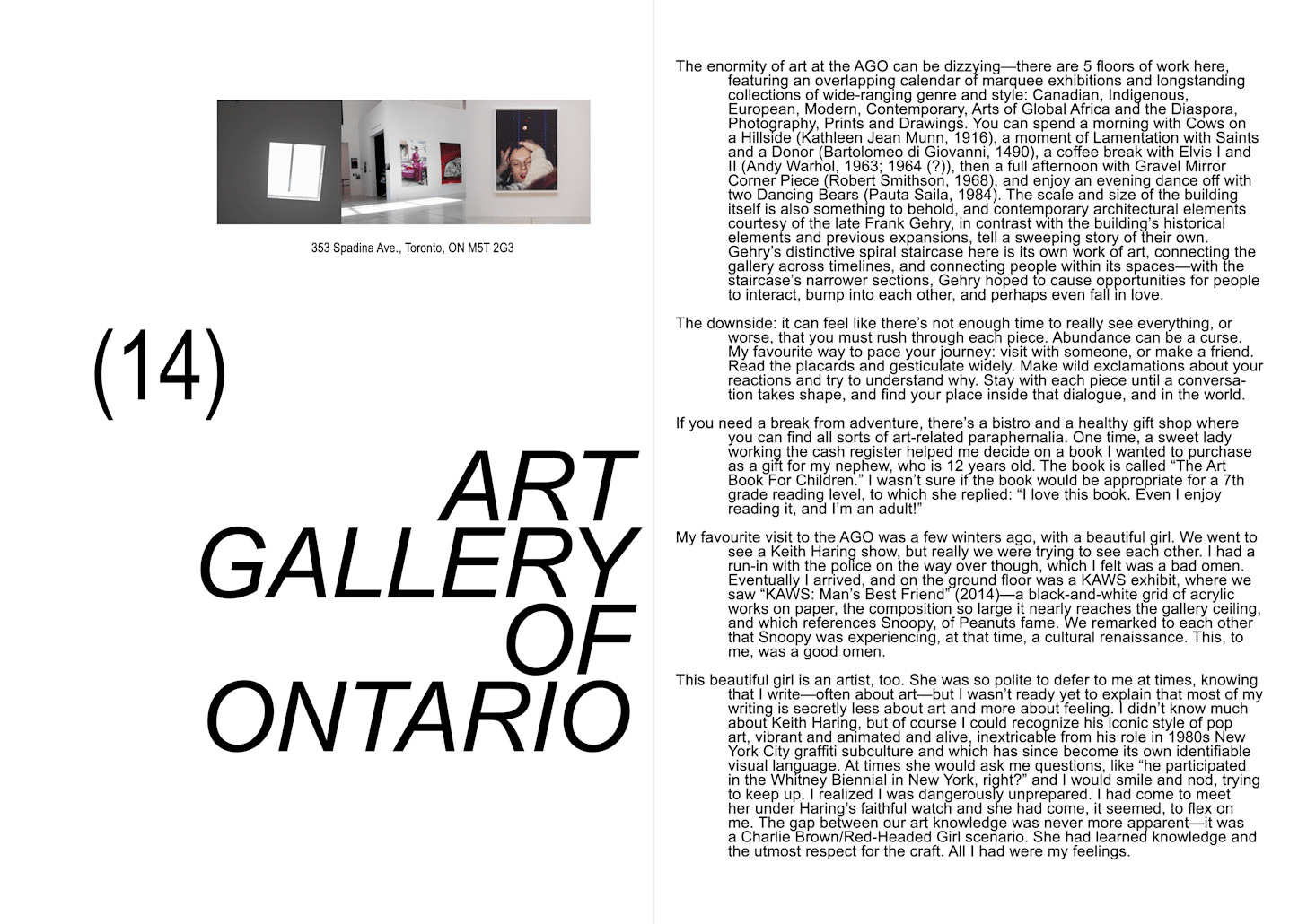 The project contains 52 reviews of places in Toronto: the University of Toronto, an indoor climbing gym, a sushi place, galleries, a soft serve ice cream place, and a magazine shop, to name a few. Chua compiled the reviews in a digital zine where they are meant to be read in order, but he is also in the process of putting them on Google Maps reviews.