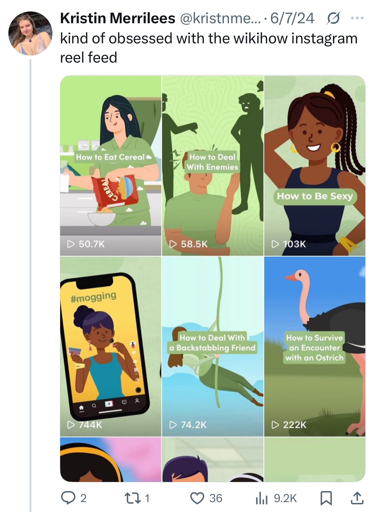 Since last summer, I’ve been increasingly intrigued by wikiHow’s Instagram strategy. The nine most recent posts, a mix of both photos and Reels, are as follows: “The ultimate guide to women’s underwear & panty types,” “How to give a girl a hickey,” “How to make out with braces,” “What’s your biggest turn-on?,” “Different kinds of high heels & how to style them,” “How to breathe while kissing,” “How to Spiderman kiss,” “How does someone become the Pope?” and “Which Zodiac signs were serial killers born under?”