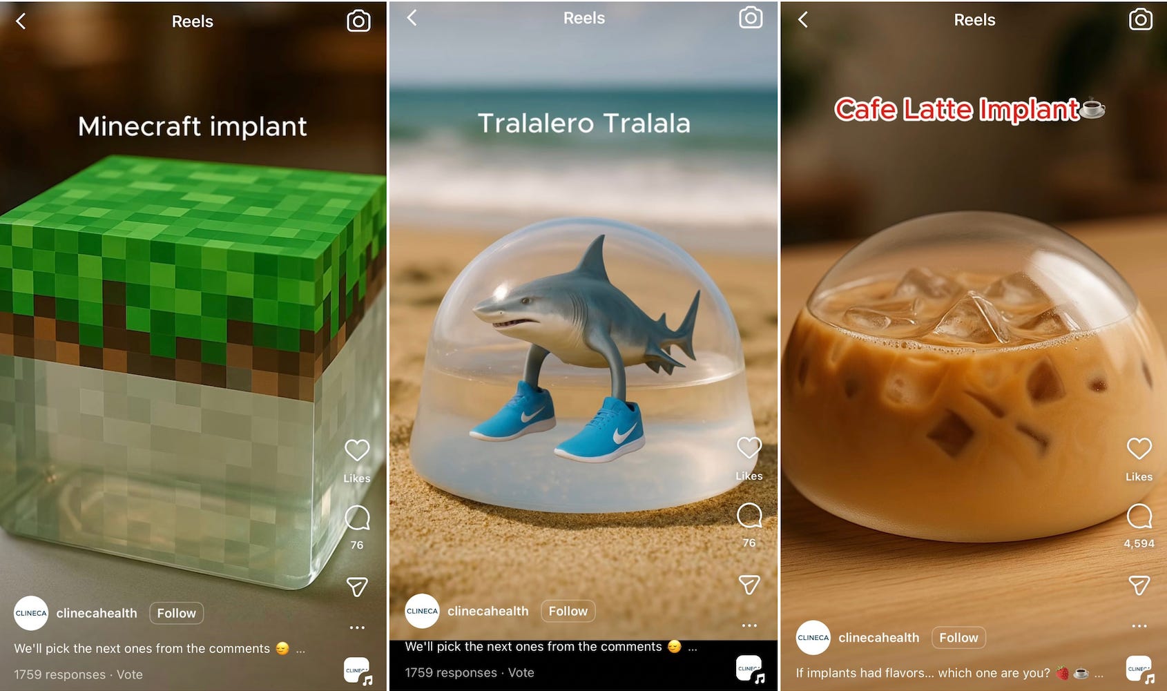 Last month, I wrote about how the AI starter pack trend was especially popular amongst estheticians, makeup companies, and other beauty professionals. A plastic surgery clinic in Istanbul called Clineca Health also participated, but that’s not the only way they’re using AI. The clinic has racked up millions of views on Instagram Reels with AI-generated images of breast implants of different flavors and themes—including a “matcha implant,” “Coca-Cola implant,” “cafè latte implant,” “nuclear implant,” “Minecraft implant,” and even one of Italian brainrot character “Tralalero Tralala.”