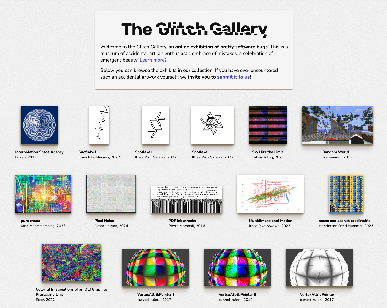 The Glitch Gallery is “an online exhibition of pretty software bugs,” established by programmer and artist blinry in 2020. It takes submissions.