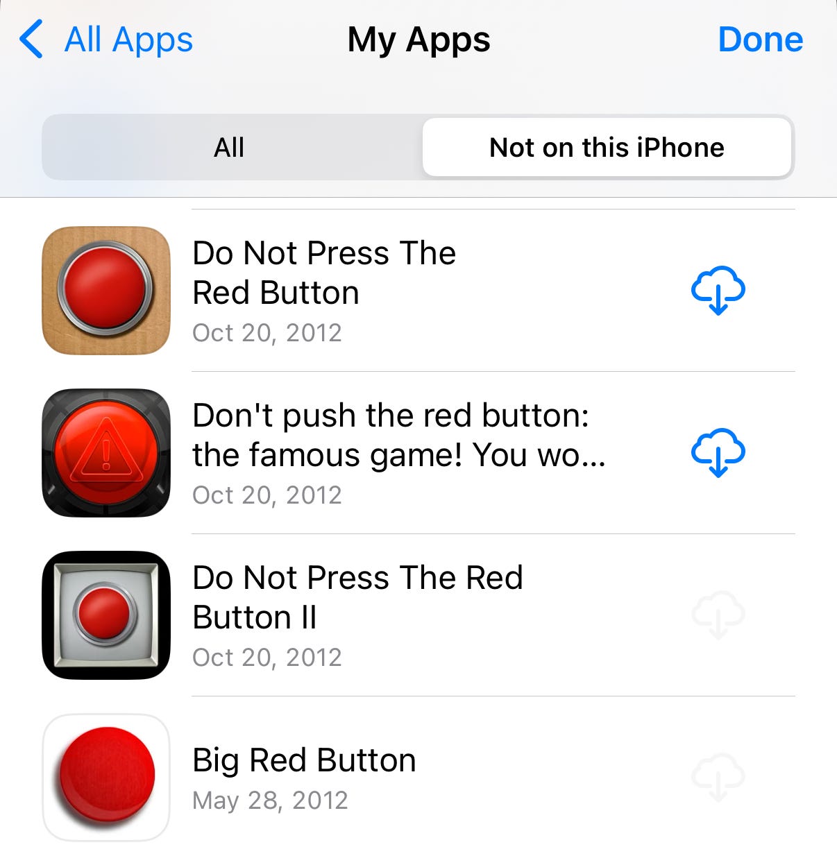 Some of these were also shared by Web Design Museum—notably, Fireplace for iPhone and Virtual Zippo Lighter for iPhone. Others I downloaded included, for some reason, four different versions of “big red button” apps.