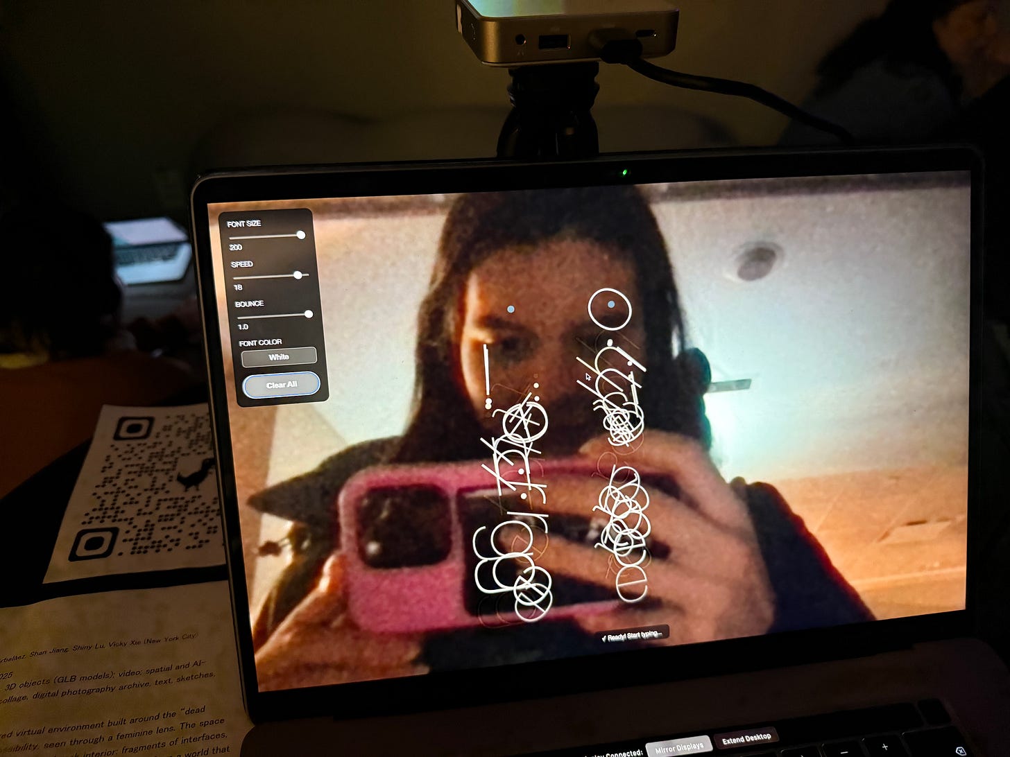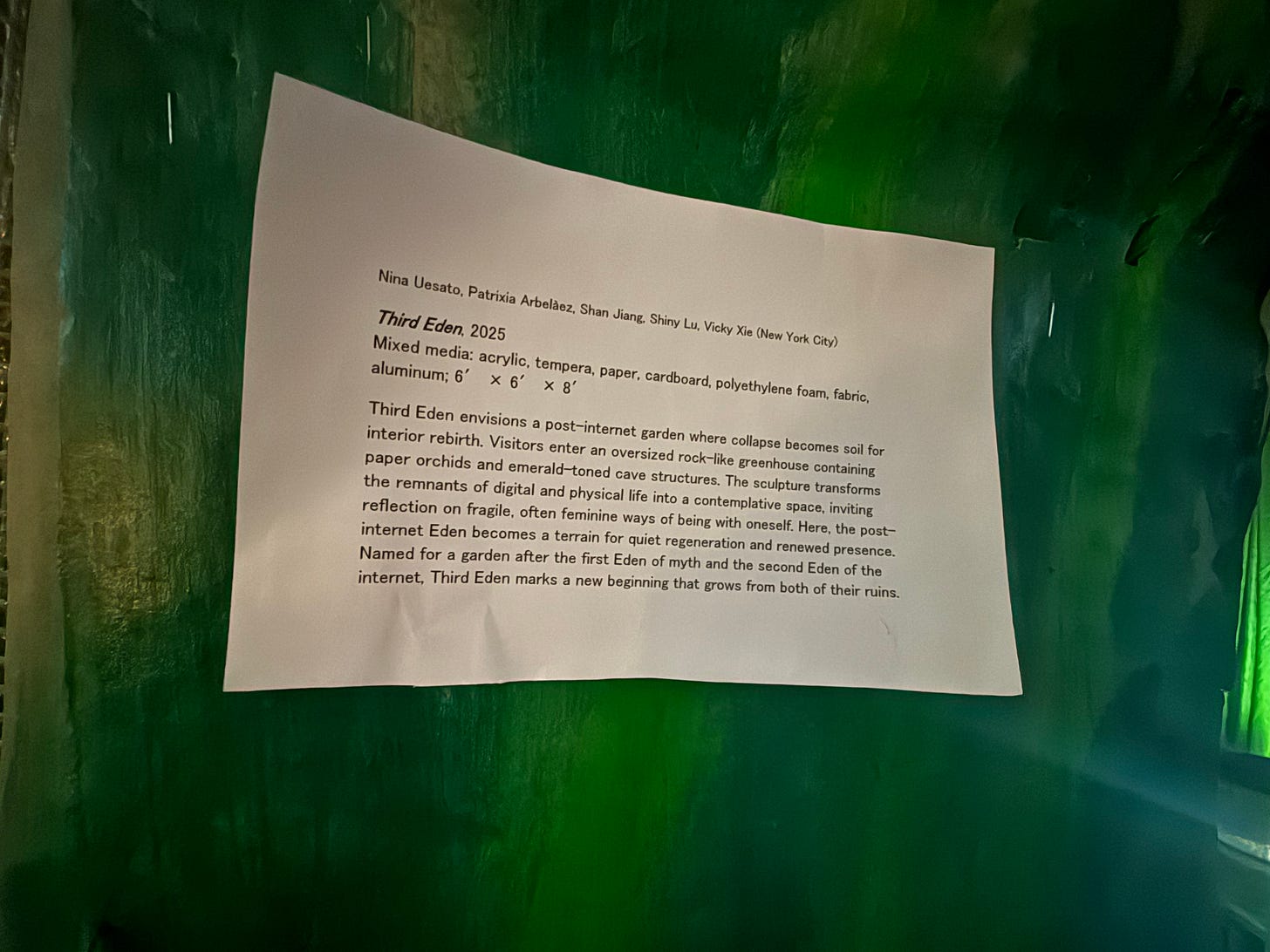 The work is based around the idea of the “dead internet” through a feminine lens, as “a strange afterlife—a garden of leftovers where feeds, glitches, and AI voices become material to be arranged.”